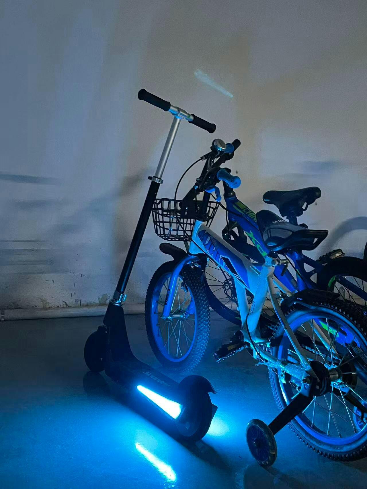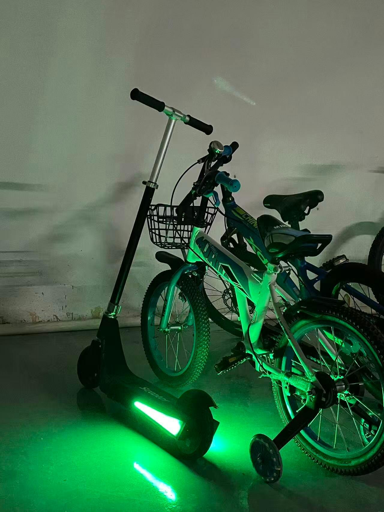 Bunte Lichter am Vorderreifen und seitliche LED-Streifen sorgen für Sicherheit und leuchtenden Fahrspaß bei jedem Abenteuer.