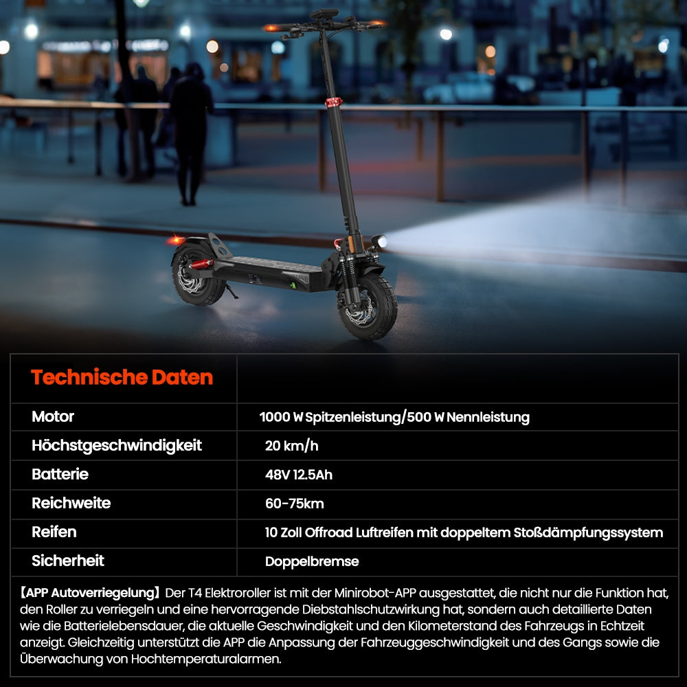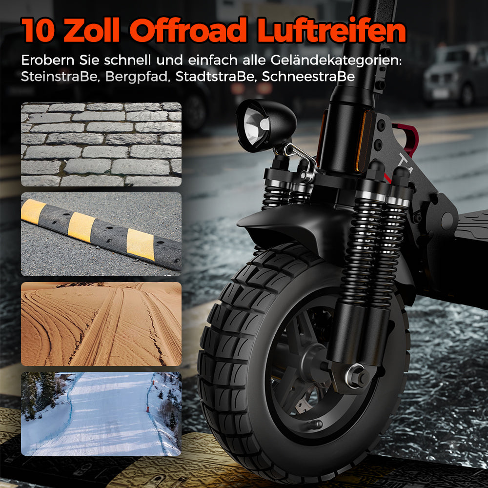 Die 10-Zoll-Offroad-Schlauchlosreifen sorgen für maximale Haltbarkeit, verbesserte Traktion, minimalen Wartungsaufwand und höchsten Fahrkomfort – selbst auf unwegsamem Gelände.