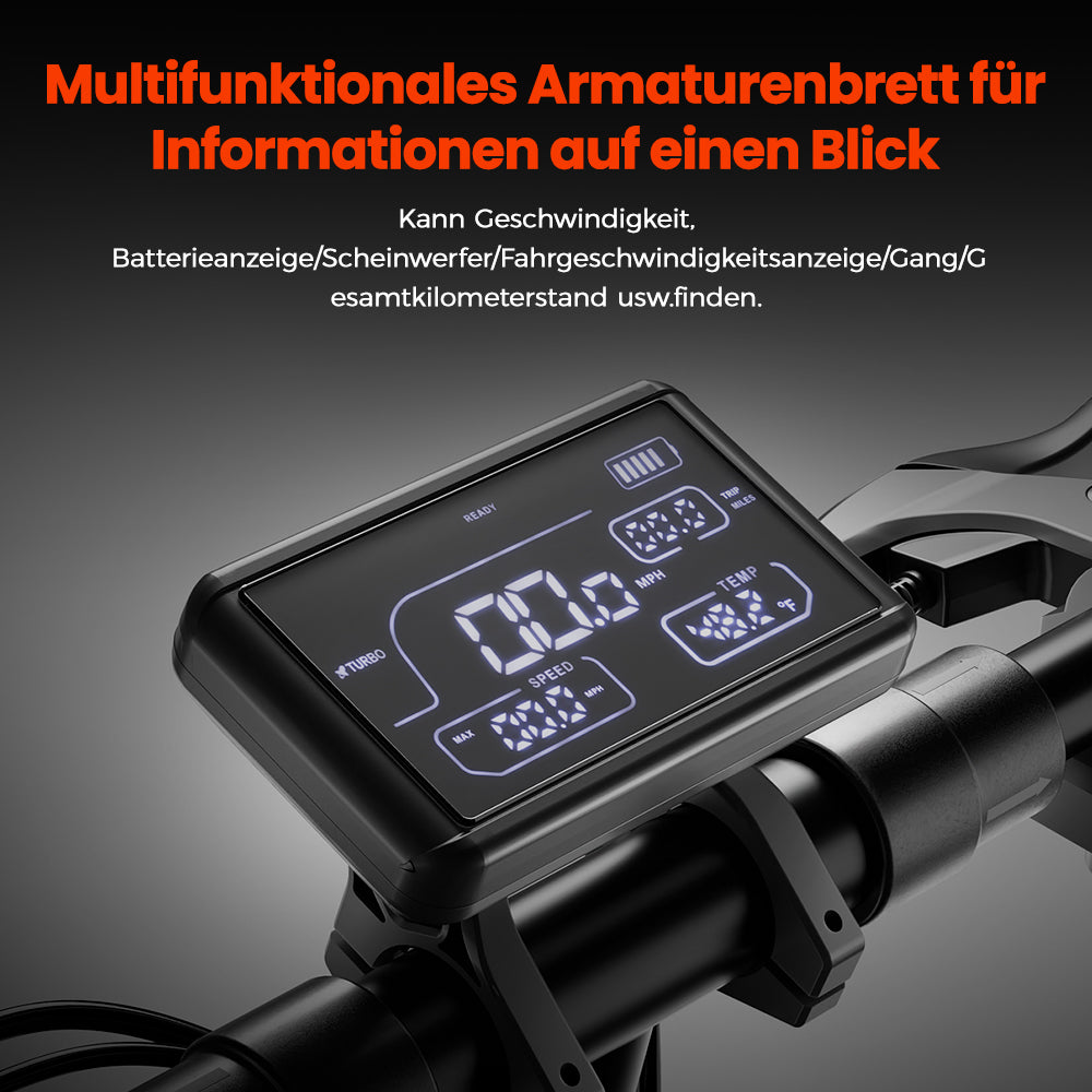 | Informationen über LED-Bildschirme | Aktuelle Geschwindigkeit, Batteriestand, Scheinwerfer, aktivierter Modus, Wartung, Temperatur, Blinker ein/aus, Fahrtstrecke, usw. |