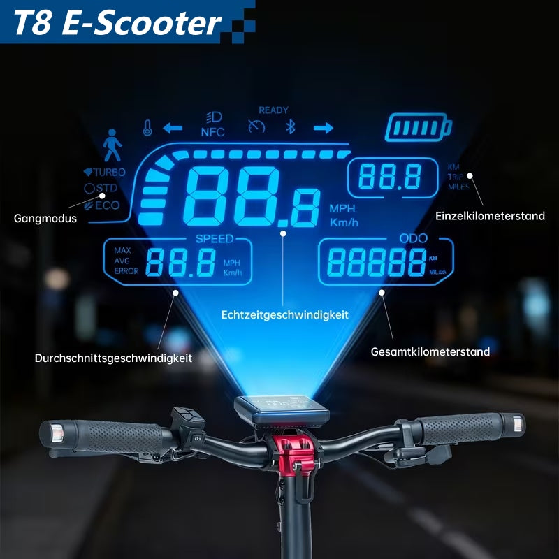 | Informationen über LED-Bildschirme | Aktuelle Geschwindigkeit, Batteriestand, Scheinwerfer, aktivierter Modus, Wartung, Temperatur, Blinker ein/aus, Fahrtstrecke, usw. |