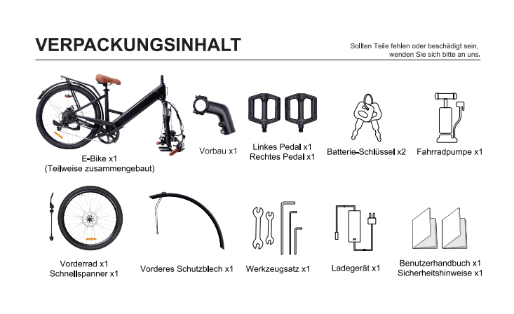 - Die angegebene Reichweite wurde im Labor bei vollem Akku, 70 kg Belastung und einer konstanten Geschwindigkeit von 15 km/h getestet. Die tatsächliche Reichweite variiert abhängig von Fahrergewicht, Straßenbeschaffenheit, Temperatur und Fahrweise.